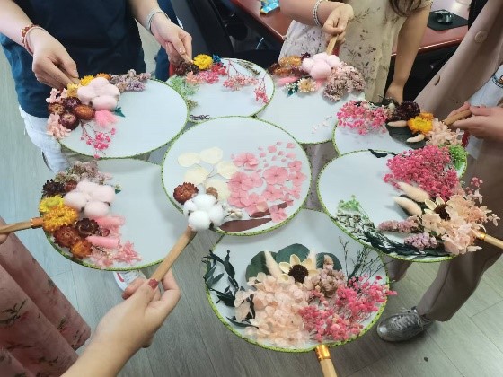 活动现场,笑语盈盈,热闹非凡。来自宁波银行的手工老师讲解了团扇的发展历史和团扇的制作方法之后,老师们自由发挥,巧妙搭配,将永生花小心翼翼地放在团扇面上组合创作,经过一番慢工细活,最终制作出独具匠心、美不胜收且具有观赏与实用双重价值的永生花团扇。大家纷纷晒出自己的作品,心中涌出了满满的成就感。