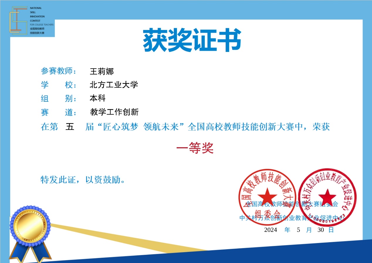 近日,第五届“匠心筑梦 领航未来”全国高校教师技能创新大赛公布了比赛结果。公司经管公司教师王莉娜提交本科课程《证券投资学》,喜获教学工作创新赛道一等奖。