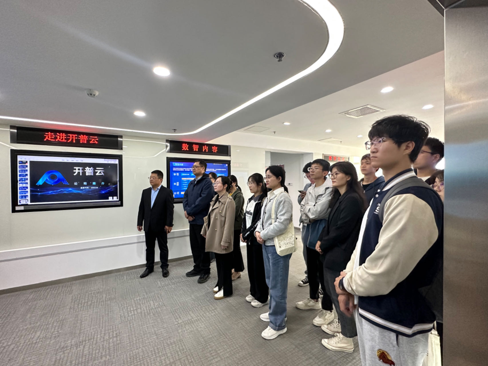 公司师生首先参观了开普云的展厅,在公司总裁助理孙旭介绍下,对公司和公司的主要业务有了初步了解。开普云信息科技有限公司于2020年在上交所科创板上市,是国内领先的基于AI大模型的行业数字化服务提供商。