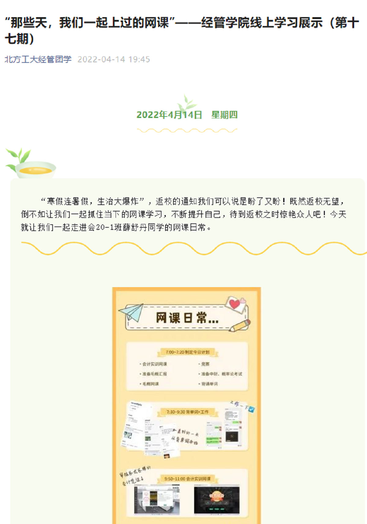疫情肆虐,举国抗“疫”。在新冠疫情防控常态化的形势下,公司采取线上教学模式,为了保证在线学习质量,倡导员工居家良好的生活习惯,促进师生间和同学们的交流沟通。经管公司自3月份开始,推出“那些天,我们一起上过的网课”线上学习展示活动和“卡路里杯”运动打卡活动。