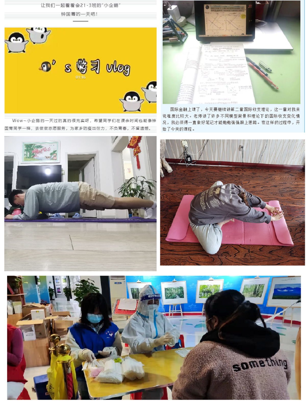 活动一经推出,员工参与热情高涨。同学们通过vlog、图片和文字等形式分享居家学习生活。大家的打卡内容广泛,除了分享上课日常外,还包含考研日常、读书笔记、英语积累、学术科研等内容。通过学习展示,为同学们提供了互相督促、互相激励的交流平台,切实提高了同学们的学习积极性。在“卡路里杯”运动打卡活动中,同学们参与居家运动项目,既有舒展身心的瑜伽,也有充满挑战的“一分钟”项目,提高免疫力,保持身心健康,为抗疫助力。