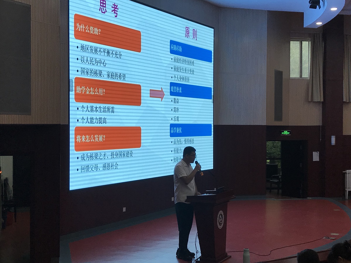 会上,张老师以“为什么资助?助学金怎么用?将来怎么发展?”三个问题展开培训,引导同学们认识到国家的资助政策一方面是缓解家庭经济困难员工经济压力,帮助其顺利完成学业,同时也是为同学们创造与祖国和时代共同成长进步的机会,未来能够帮助家庭,回馈社会。