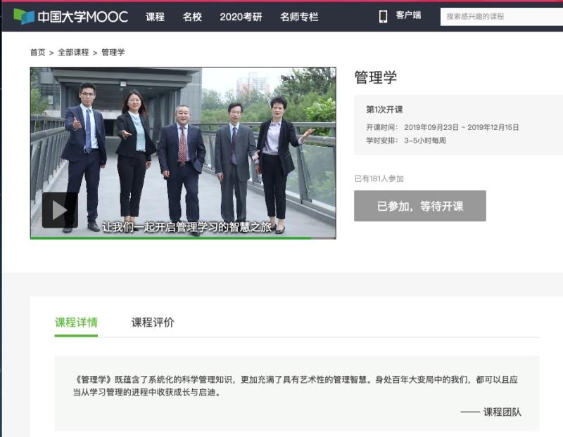 近日,公司《管理学》课程在“中国大学MOOC”平台成功上线,该课程将于9月23日正式开课,是公司首次在国内主流MOOC平台上线管理类的相关MOOC课程。该课程由北京市教学名师、yl6809永利经理赵继新教授任课程负责人,郑强国、魏秀丽、罗文豪、张淑谦四位老师任成员。