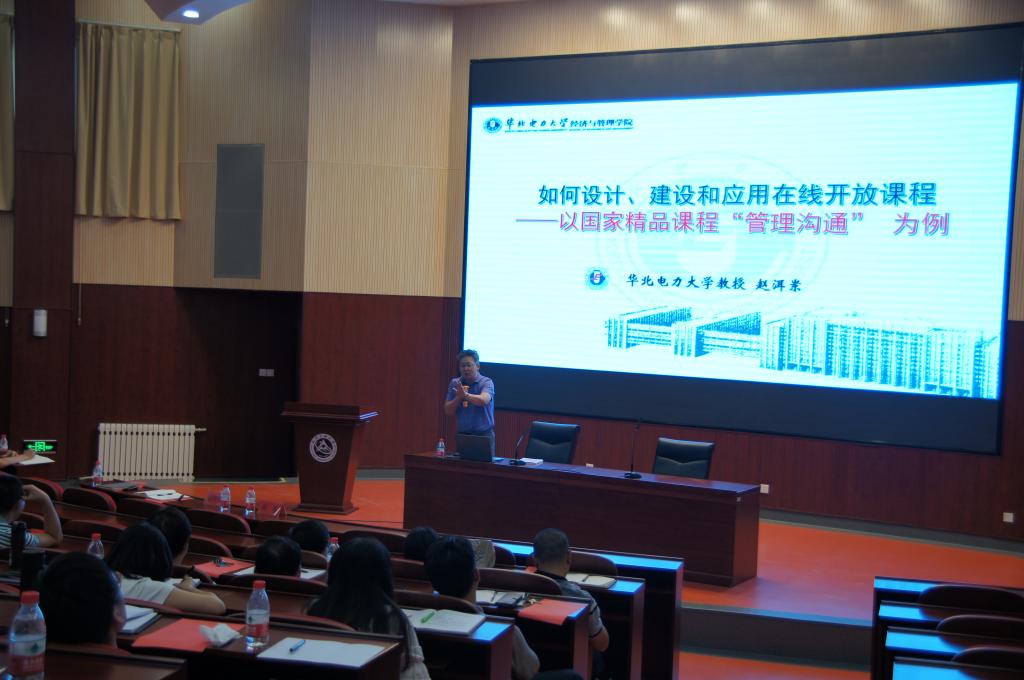 华北电力大学赵洱岽教授作题为《如何设计、建设和应用在线开放课程——以国家精品课程<管理沟通>为例》的主题报告。赵洱岽教授在报告中分享了在线开放课程建设的诸多经验,尤其是在实践中提炼出的“3-4-6-3”全体系建设模式,使老师们深受启迪。