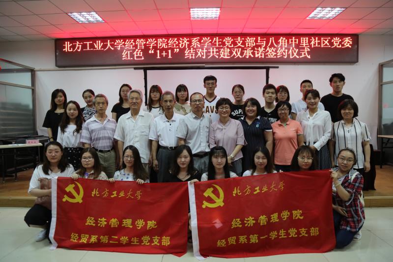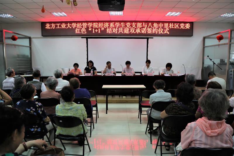 2018年6月7日下午3点,yl6809永利经济系第一、第二员工党支部与石景山区八角中里社区党委“红色1+1”结对共建双承诺签约仪式在八角中里社区会议室举行,八角街道工作委员会副书记王建强,八角中里社区党委书记李美红、副书记王君,八角中里社区党委成员与社区党员,公司党委副书记赵洁、经济系第一员工党支部书记赵晓男、经济系第二员工党支部书记白小伟以及经济系14、15、16级部分员工党员出席了本次活动。