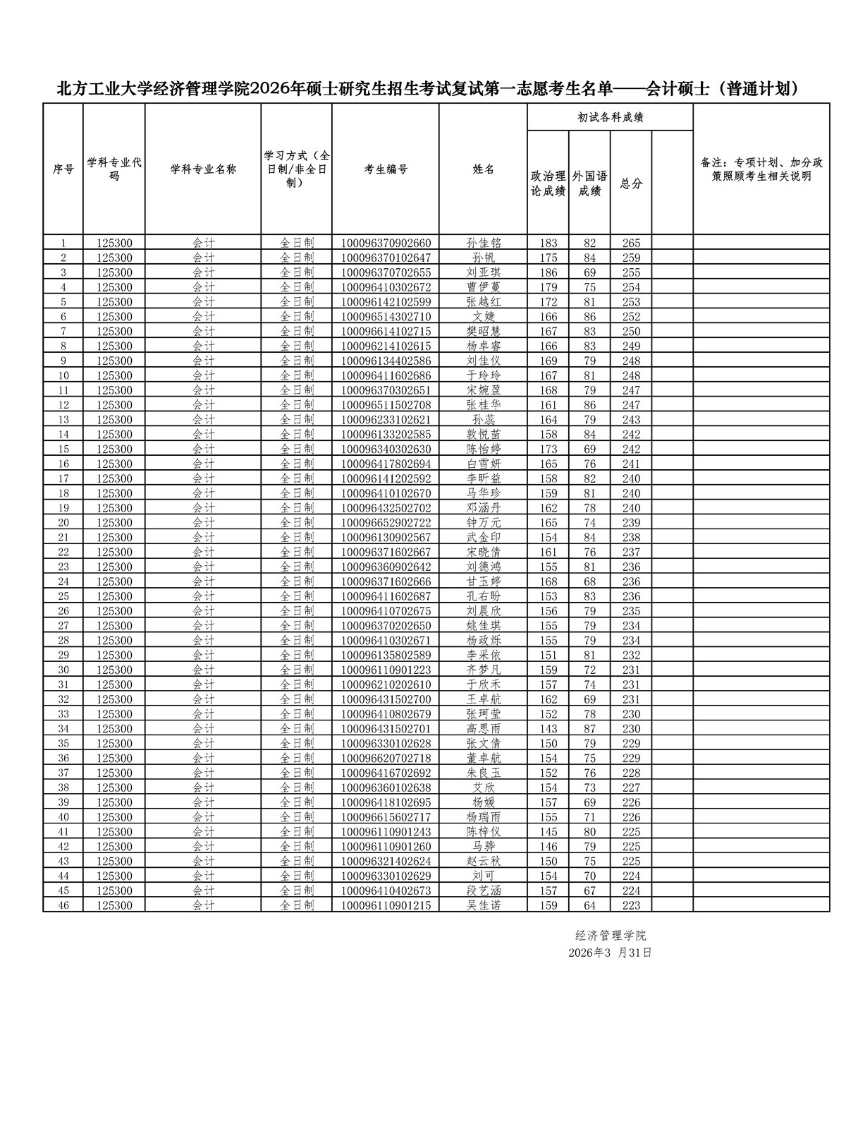 yl6809永利2026年硕士生招生第一志愿考生复试结果——工商管理MBA(全日制)
