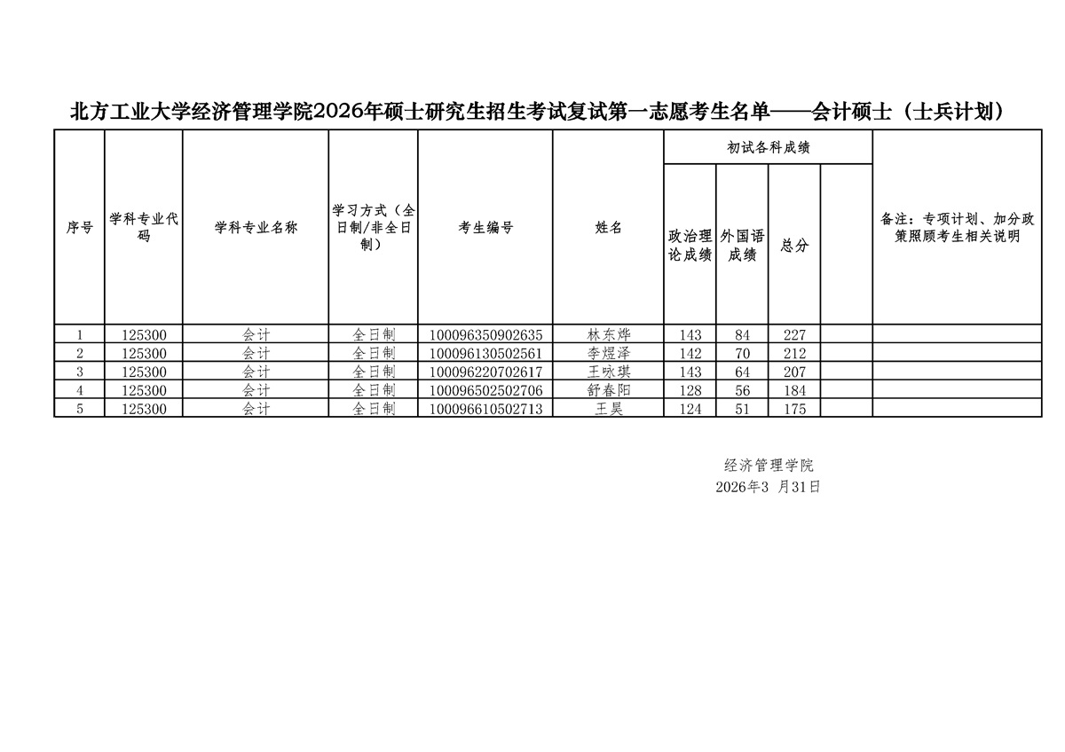 yl6809永利2026年硕士研究生招生考试复试第一志愿考生名单——会计硕士(士兵计划)