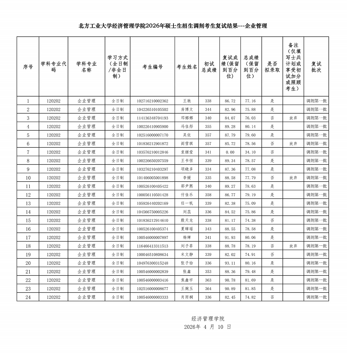 yl6809永利2026年硕士生招生调剂考生复试结果---企业管理