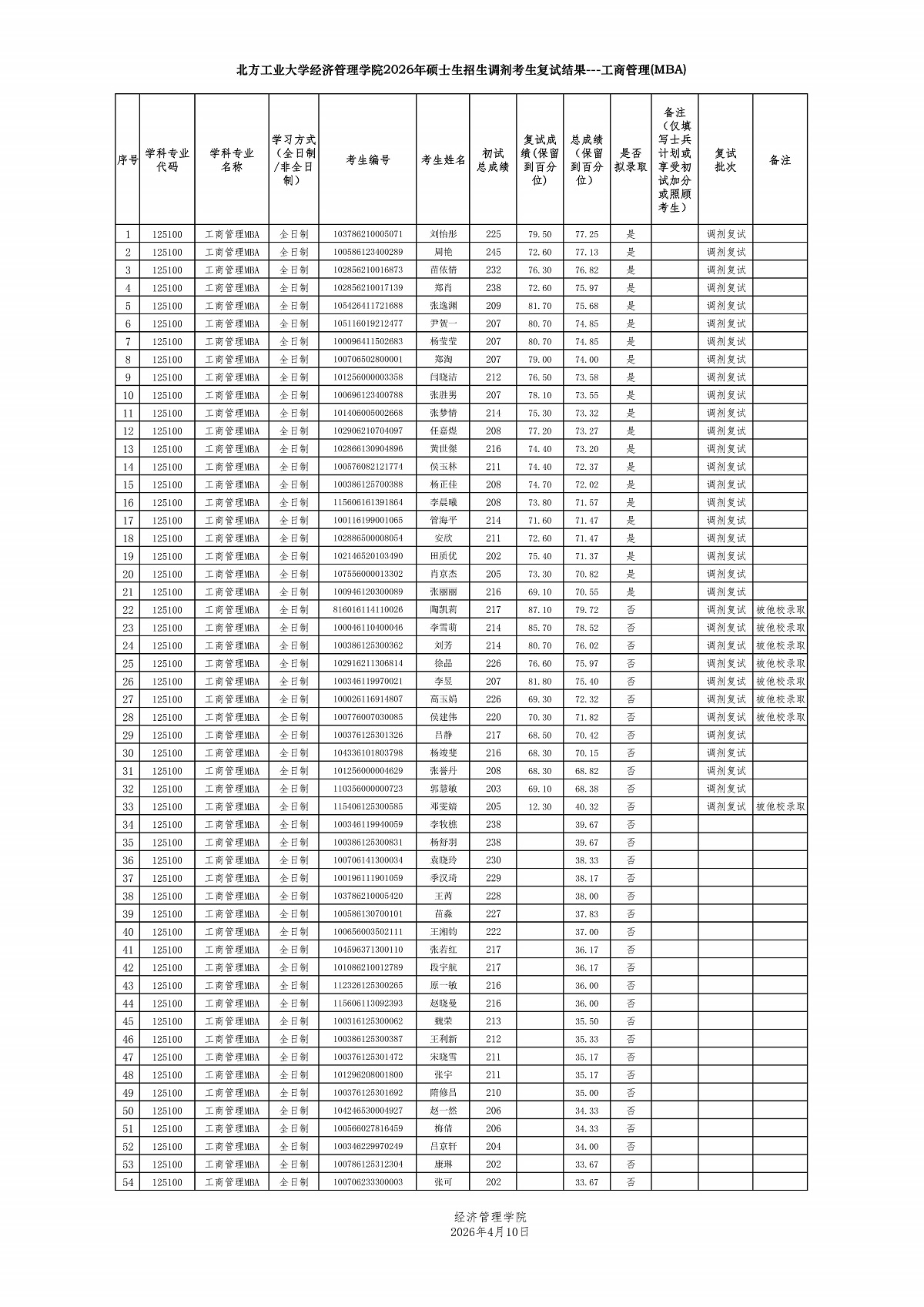 yl6809永利2026年硕士研究生招生考试复试调剂考生名单 ---MBA(全日制)