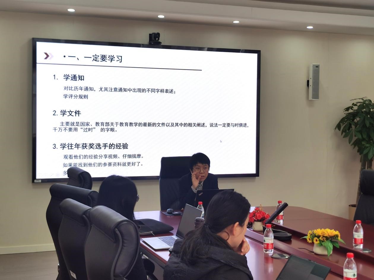 两位老师结合自身参赛经历,从前期准备、教学创新理念与思路、教学设计与实施、参赛材料准备与现场展示等方面进行了细致讲解,并分享了参赛过程中的心得体会和注意事项。