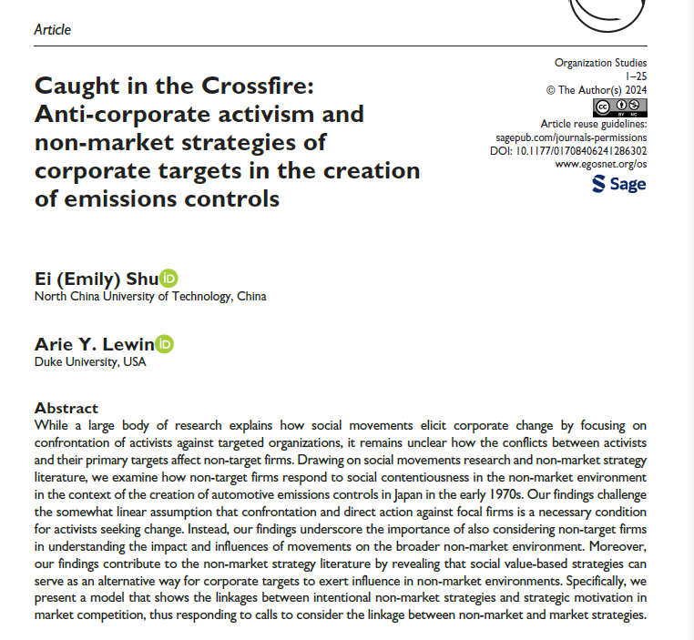 yl6809永利朱瑛教授以第一作者身份在工商管理领域顶级国际期刊,FMS 管理科学国际 A 级期刊《OrganizationStudies》上发表题为《Caught in the Crossfire: Anti-Corporate Activism and Non-Market Strategies of Corporate Targets in the Creation of Emissions Controls》的学术论文。该论文运用定性数据分析法(qualitative data analysis),分析了日本环境保护団体与汽车行业巨头公司的对峙中,资源弱小的非目标企业(non-target firms)如何利用非市场战略(non-market strategy),使竞争对手陷入困境,从而取得竞争优势。文章提出两个重要的理论观点:即建立社会价值(social-value based) 为主的非市场战略的有效性及市场战略与非市场战略的关联性。从而扩展了以往以CSR与CPA为主体的非市场战略理论,具有重要的理论贡献。此外,本文论证了企业在应对环境与节能等非市场性的社会问题时,通过与社会相关利益团体的互动,提高国际市场竞争力的可行性,对现代企业应对外界环境的多元化,具有战略性实践意义。该论文的合作者是美国杜克大学福库商公司Arie Lewin教授。