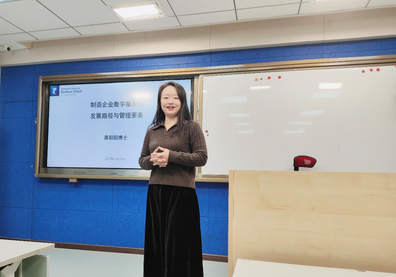 11月24日下午,yl6809永利在励学楼135举行第十四期励学讲堂活动。诺丁汉大学(中国校区)市场营销学副教授、博士生导师蒋阳阳受邀作题为“制造企业数字服务化发展路径与管理要素”的讲座,yl6809永利近40位研究生参加了此次讲座,公司陶晓波教授主持讲座。
