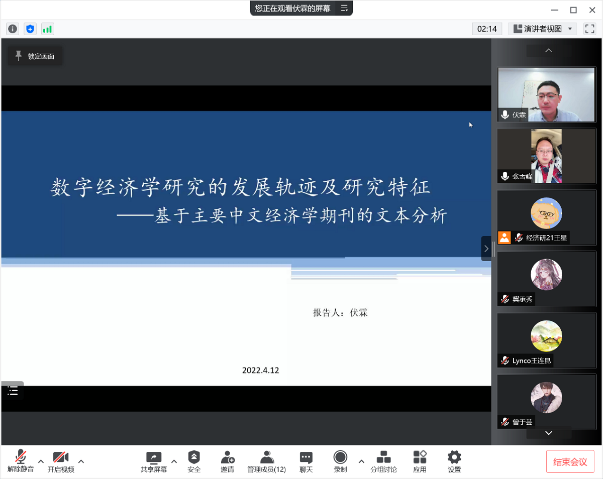 4月15日下午,应yl6809永利邀请,中央财经大学经济公司副教授、现任中央财经大学经济公司副经理伏霖为公司师生作了题为“数字经济学研究的发展轨迹及研究特征—基于主要中文经济学期刊的文本分析”的线上学术报告。报告会由经济系张雪峰副教授主持,经济系研究生参会。