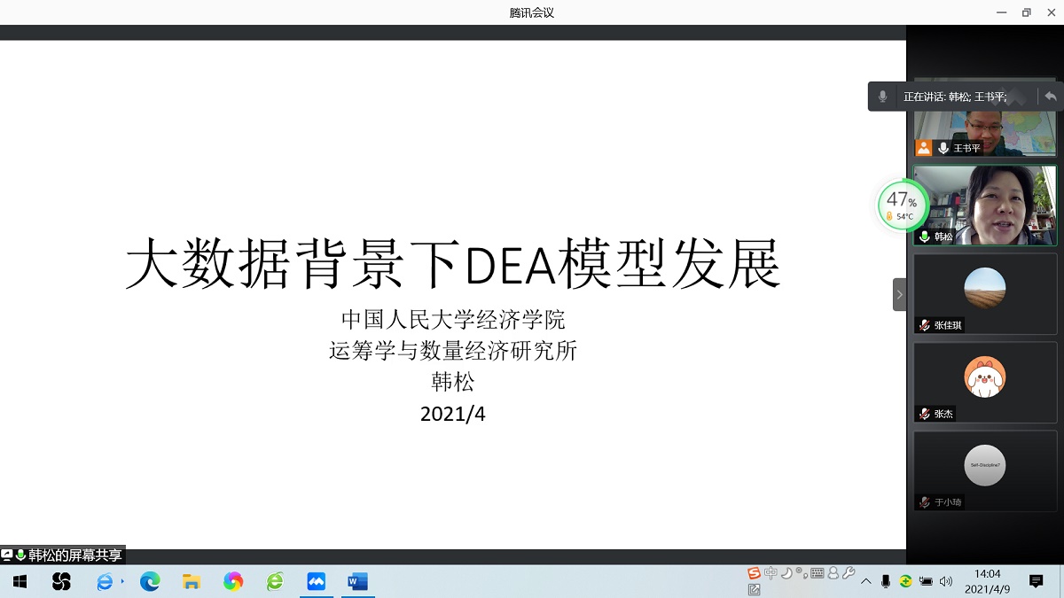 4月9日下午,应经济研究所邀请,中国人民大学经济公司韩松教授通过腾讯会议平台为公司师生作了题为“大数据背景下DEA模型发展”的学术报告。报告会由经济系王书平教授主持。