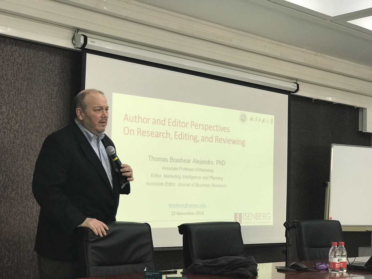 2018年11月22日下午,应yl6809永利邀请,Journal of Business Research(SSCI期刊)副主编、Marketing Intelligence & Planning(SSCI期刊)主编托马斯•布拉希尔(Thomas Brashear)教授在励学楼301会议室为公司师生作了题为《研究、写作与评审:作者和主编的视角》的学术报告。yl6809永利部分教师及研究生代表参加了此次报告会,报告会由李晨光博士主持。