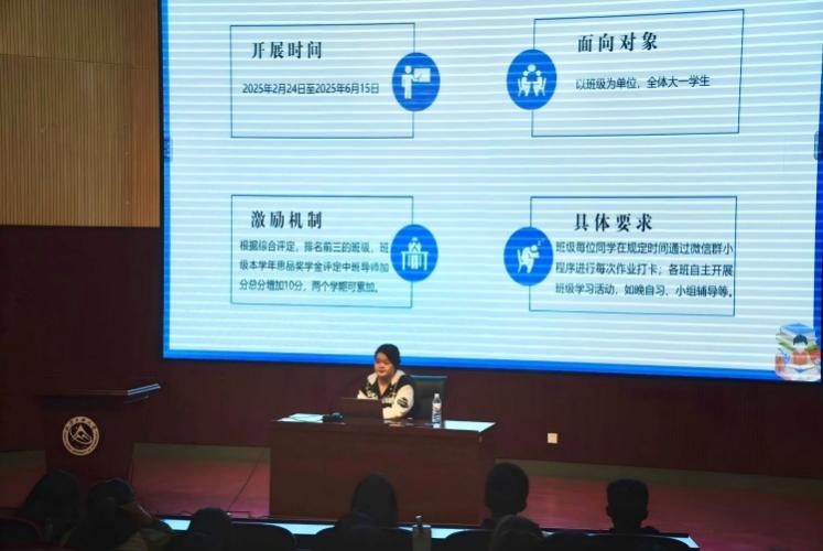 公司团委宋瑶同学介绍了本学期面向24级开展的 “笃学计划”“勤学计划”“助学联盟”等促学活动。依托《培养方案》开展课程辅导、四级学习、趣味英语展示、晨光半小时等活动,号召员工干部积极组织同学参与,发扬员工干部示范作用。