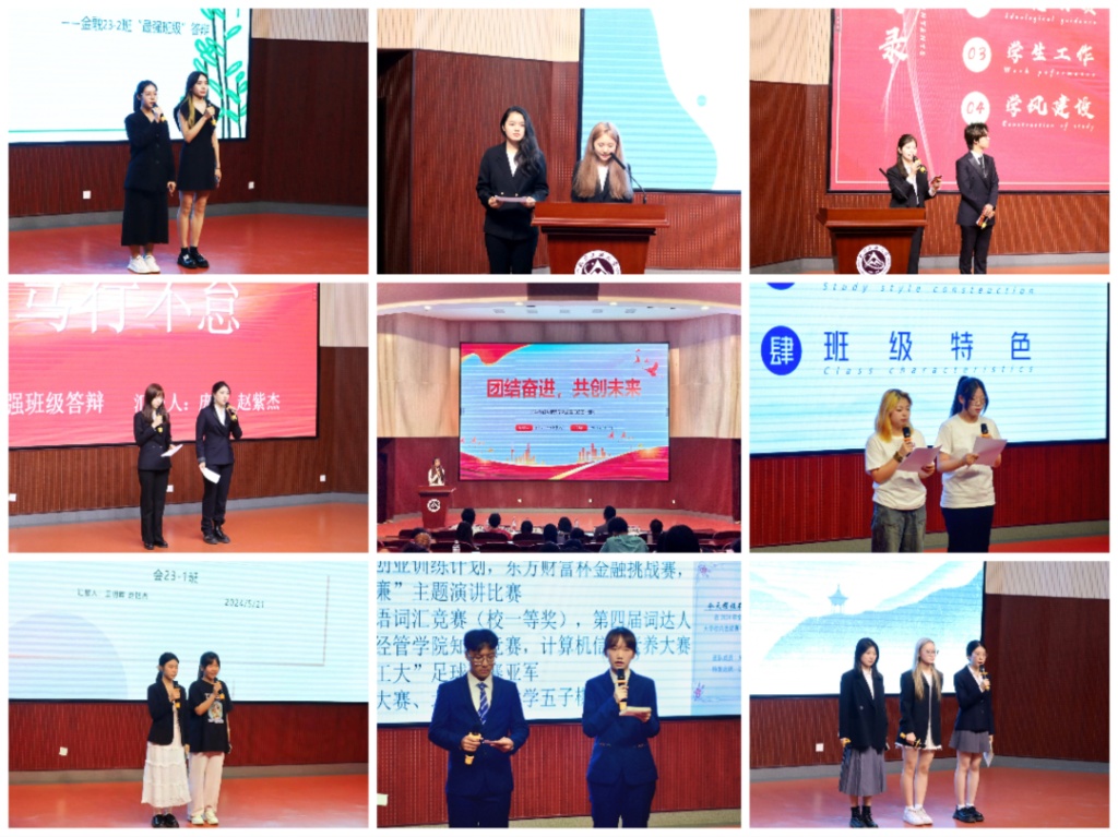 高年级组8个班级,低年级组12个班级依次进行答辩。各班代表分别从思想建设、学风引领、竞赛参与、志愿服务等方面进行汇报。各具特色的班级文化展现了同学们蓬勃向上的精神风貌。