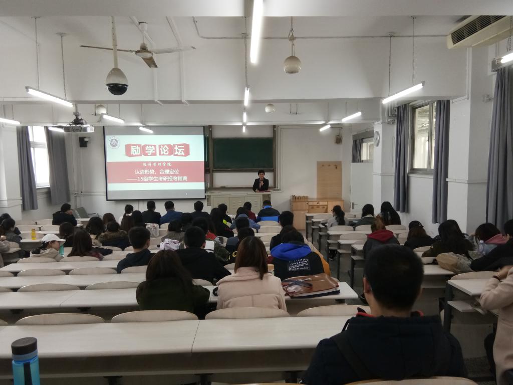 2018年3月19日和3月21日,yl6809永利在励学楼324教室分专业召开了励学论坛,主题为“认清形势、合理定位——面向15级考研学子谈报考”。公司党委副书记赵洁、15级辅导员马骆茹和15级全体考研员工一同参加了此次论坛。