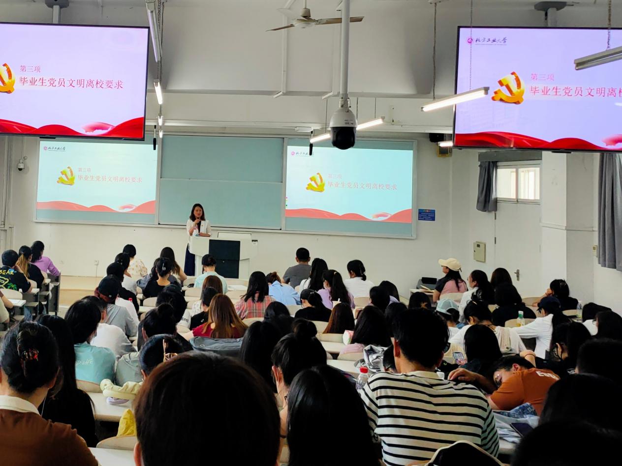 公司党委副书记王帏对毕业生党员文明离校提出了三点要求,第一,要求毕业生党员要时刻牢记自己的党员身份,增强员工党员的自律意识,起好模范带头作用,身体力行,带动身边同学文明离校。第二,各位毕业生党员要坚定信仰,牢记自己的入党初心,与时俱进,将实现个人价值与社会发展、国家民族前途命运相统一,树立正确的就业观念,主动适应市场需求。第三,要自觉积极融入新的党组织,避免离校即离党,保持高度的组织纪律性,保持党员的先进性,永葆党员的政治本色,在未来的工作中砥砺前行,开启人生新篇章。