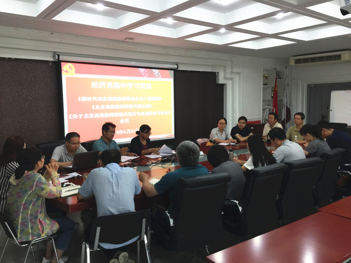 为深入贯彻习近平新时代中国特色社会主义思想和党的十九大精神,深入贯彻落实全国和北京市教育大会精神,6月21日上午,经济系全体教师在励学楼301会议室集中学习《新时代北京高校教师职业行为十项准则》、《北京高校教师师德考核办法》、《关于北京高校教师师德失范行为处理的指导意见》等三个文件。yl6809永利陶晓波副经理参加了本次会议。